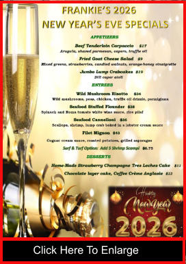 Frankie's Pizza & Grill features a diverse menu that offers something for everyone. The restaurant features traditional Italian dishes, hand tossed, thin crust pizza, fresh grilled entrees and burgers, popular salads and unique appetizers.
