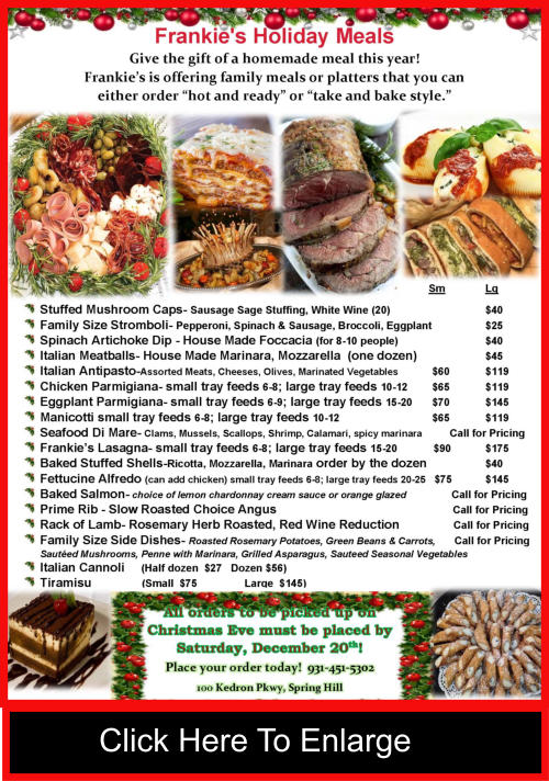 Accepted Payment Methods: Frankie's Pizza And Grill 100 Kedron Parkway Spring Hill, Tennessee 37174Telephone: 931- 451- 5302 Email: Info@frankiespizzaandgrill.com